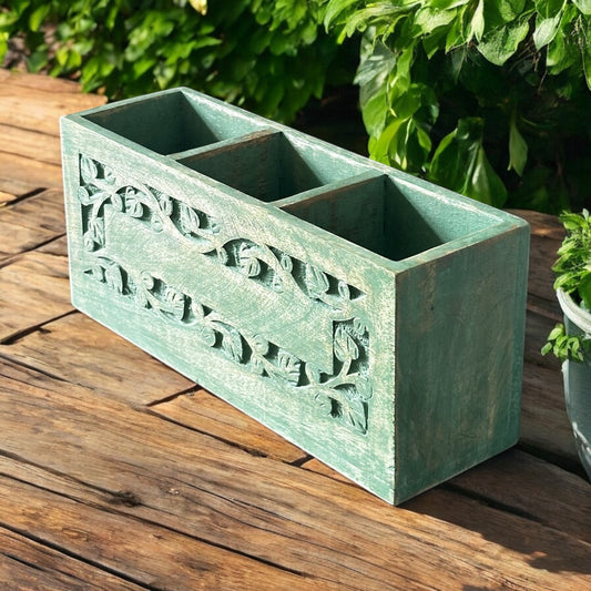 Mango Grove Washed Green Antique Leaf-Embossed Cutlery Holder - single