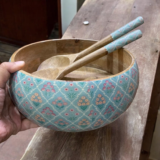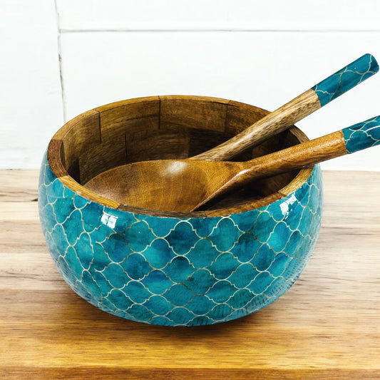 Meraki Turquoise Dream Mango Wood Salad bowl with 2 Servers