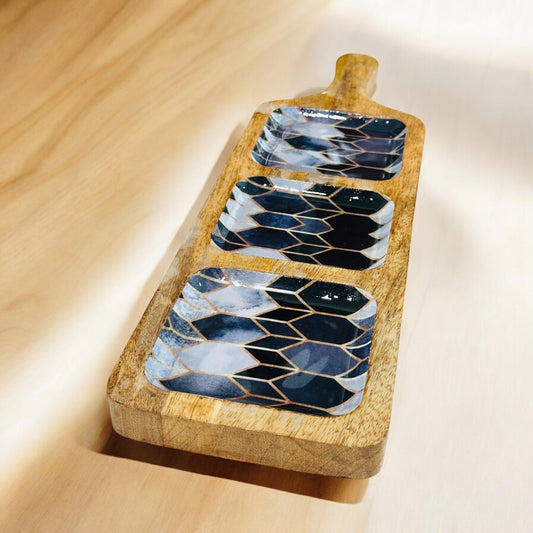 Meraki Contrast Geometric Elegance Mango Wood Three Part Platter - single