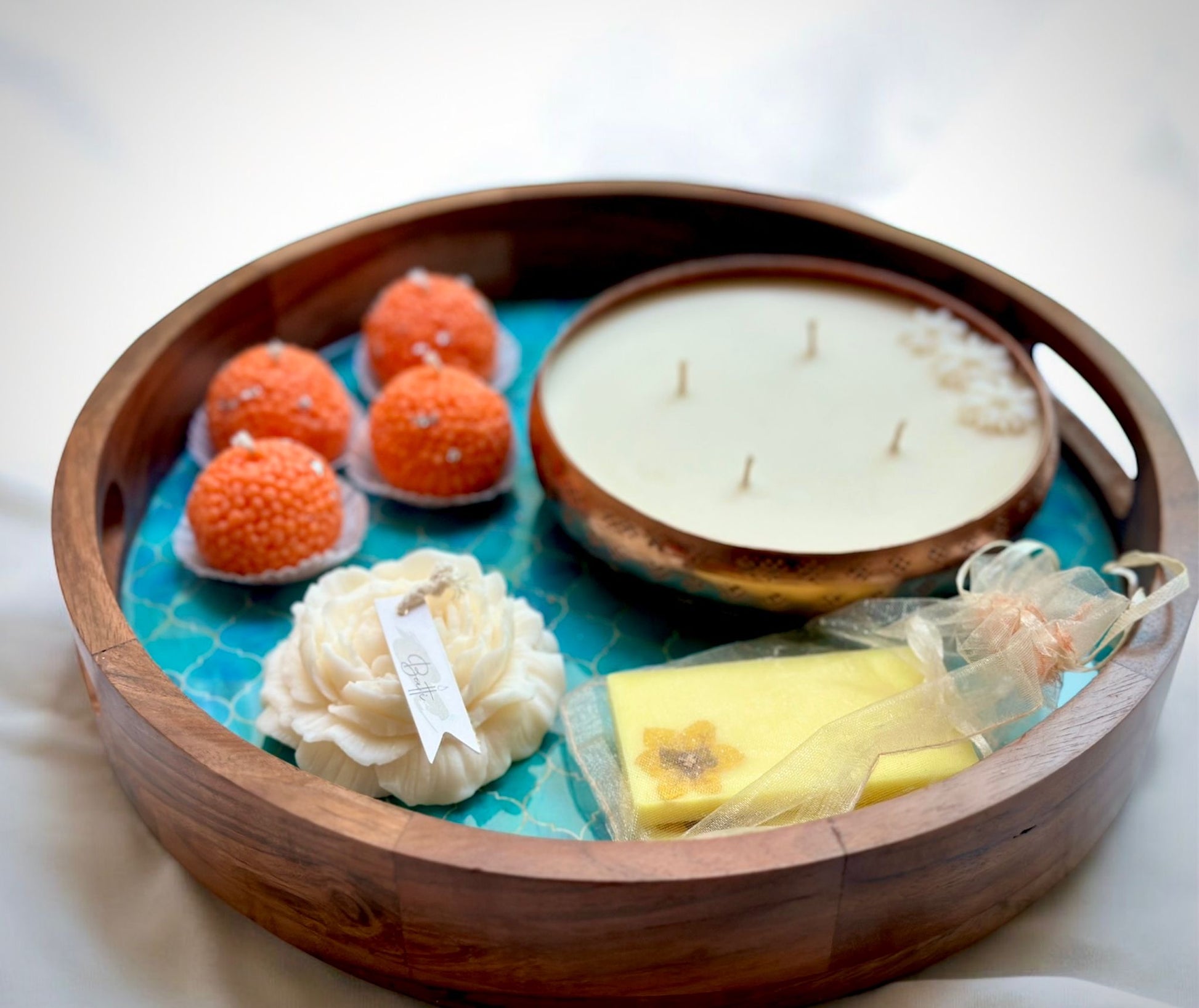 Sustainably Radiant Hamper ft acacia wood turquoise dream tray and aromatic candles