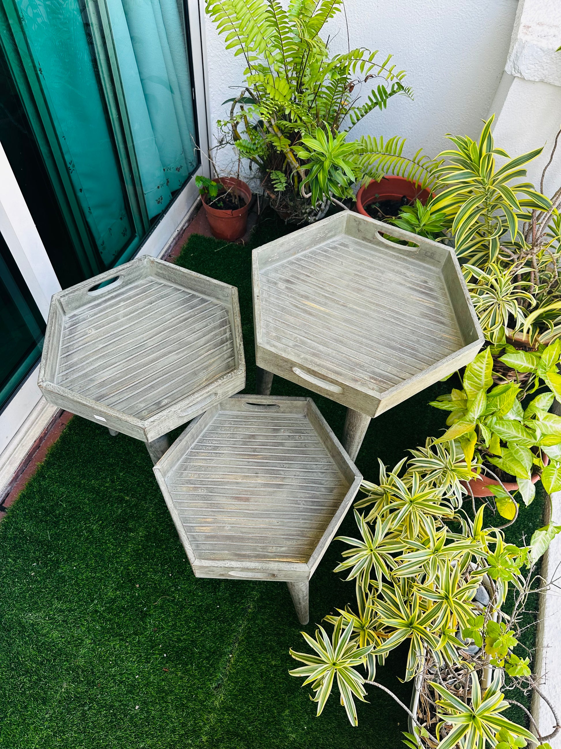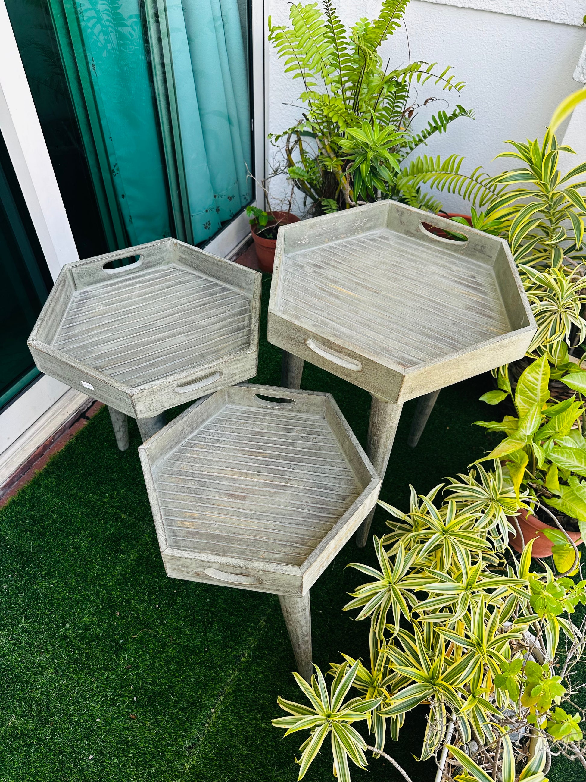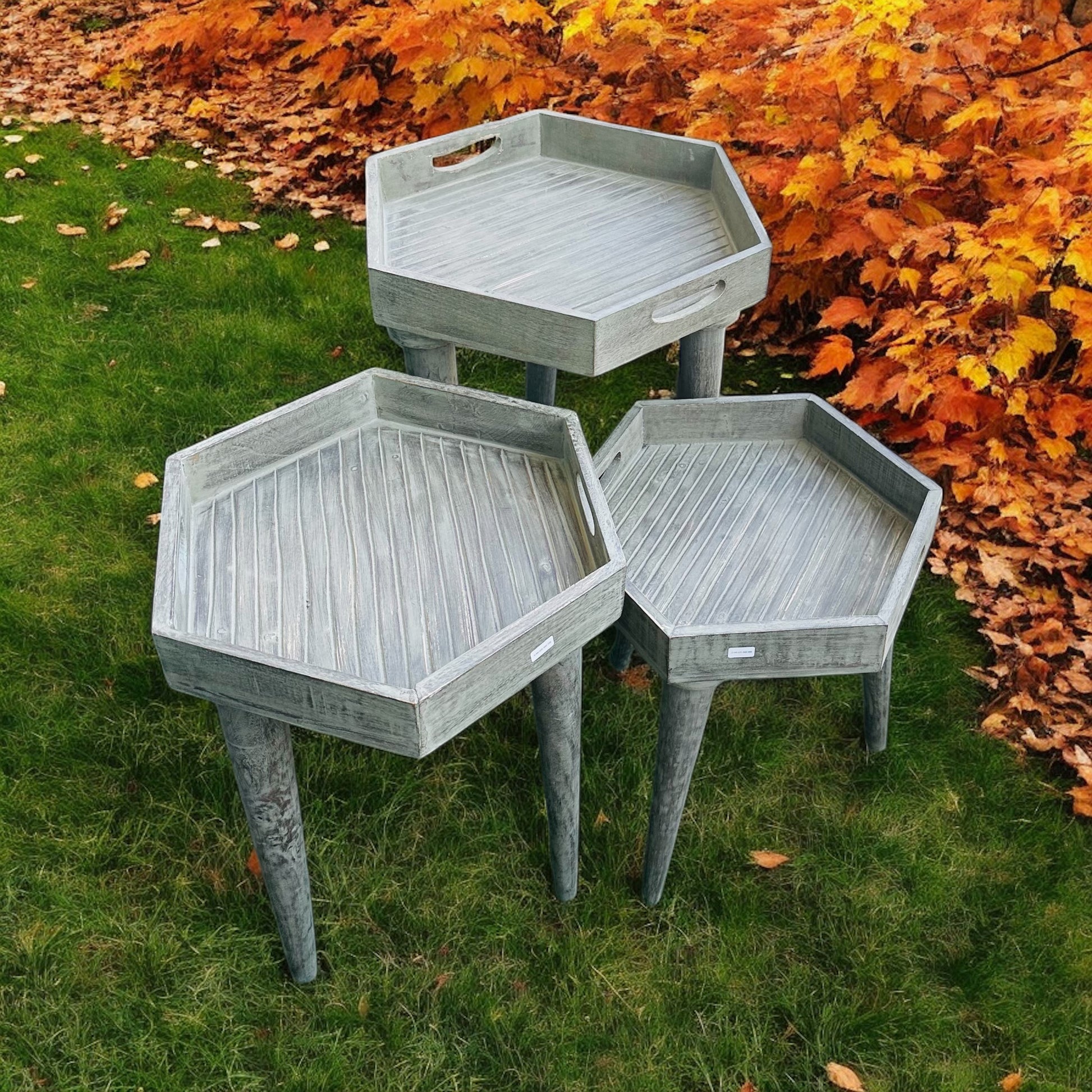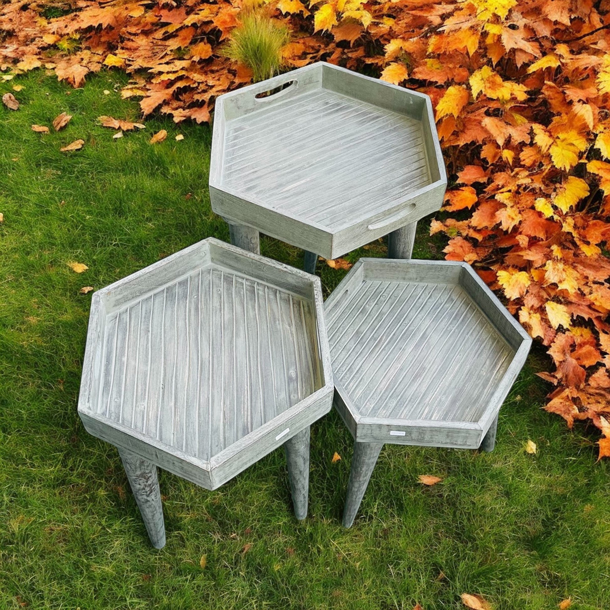 Elevate your living space with this exquisite set of six-sided hexagon side tables, crafted from premium mango wood. Each table is thoughtfully designed with a washed grey finish that gives a charming antique look.