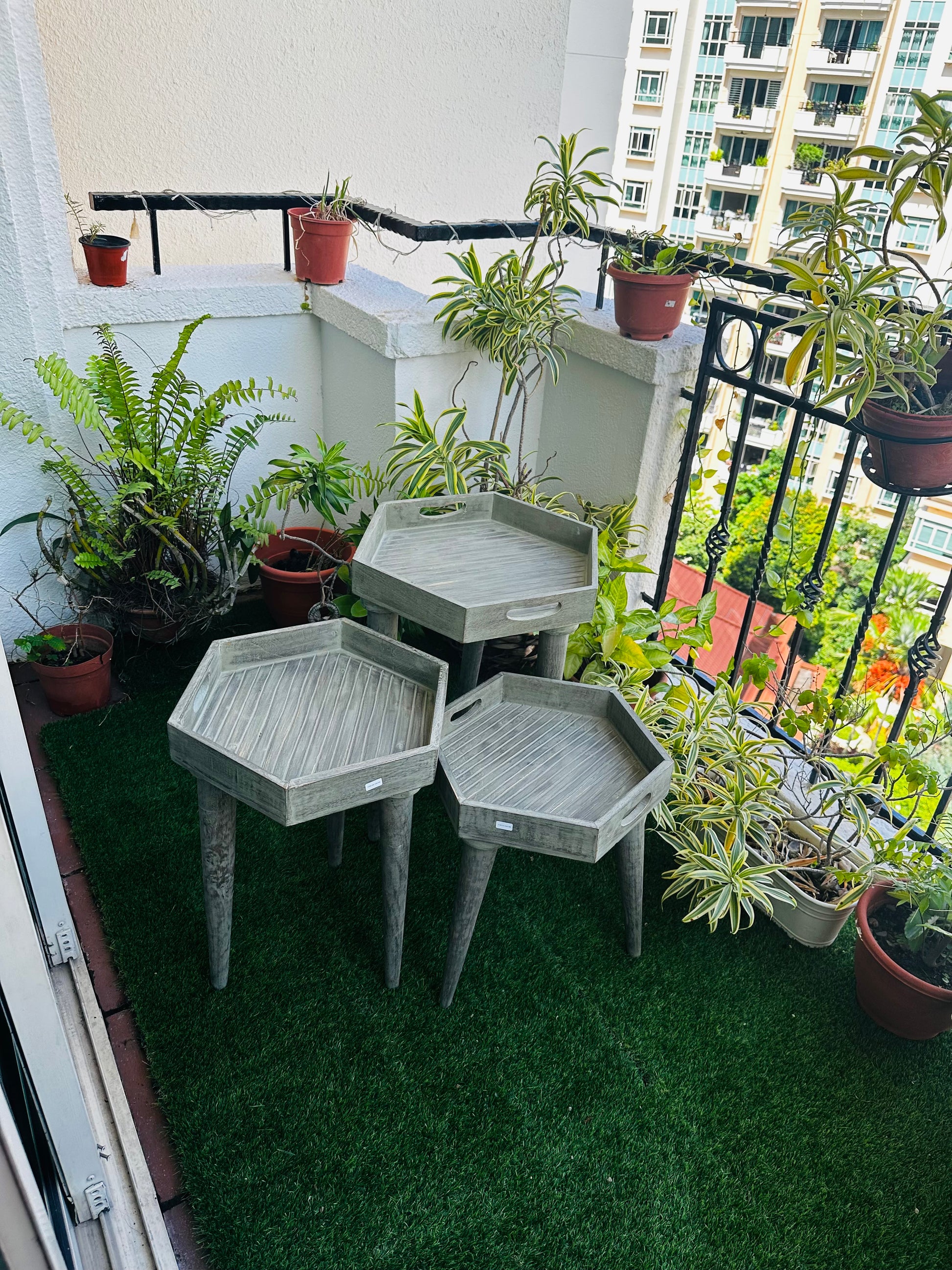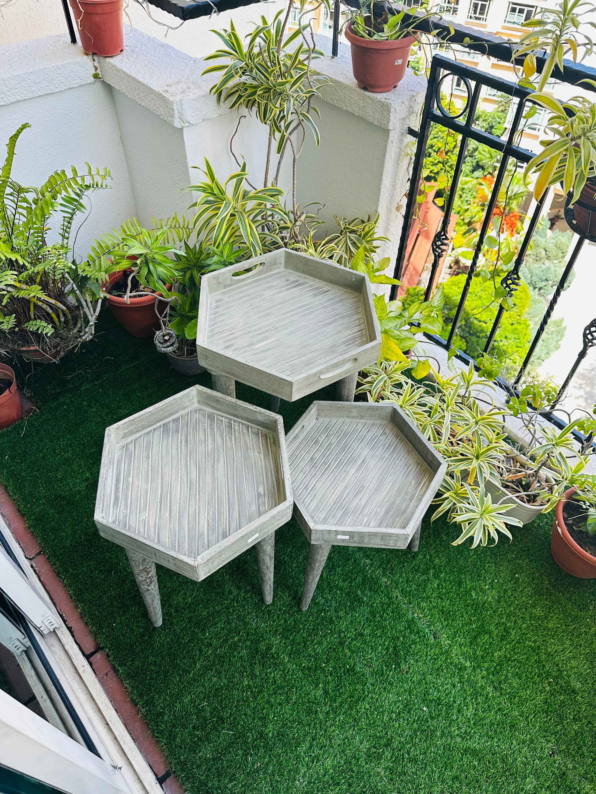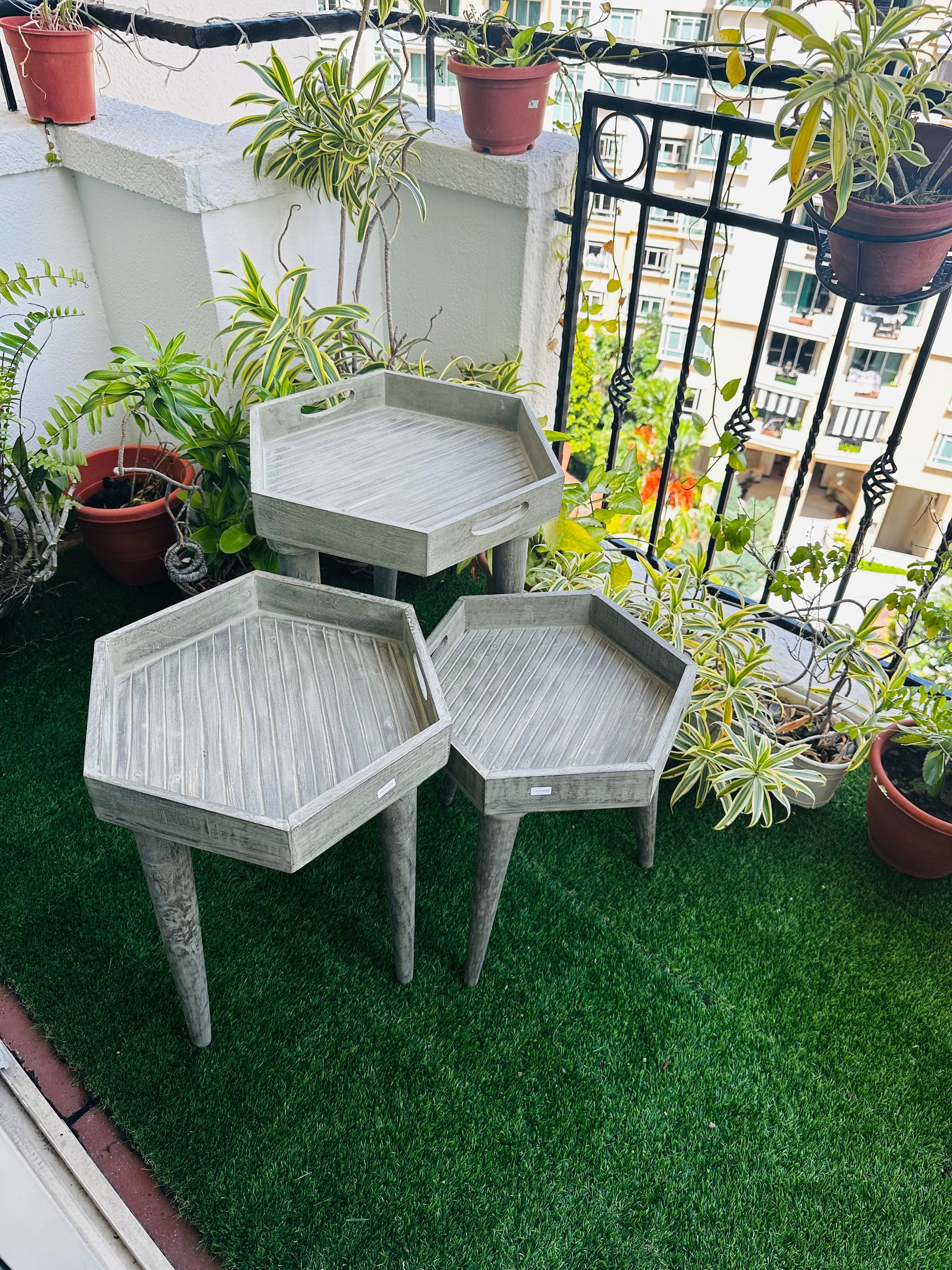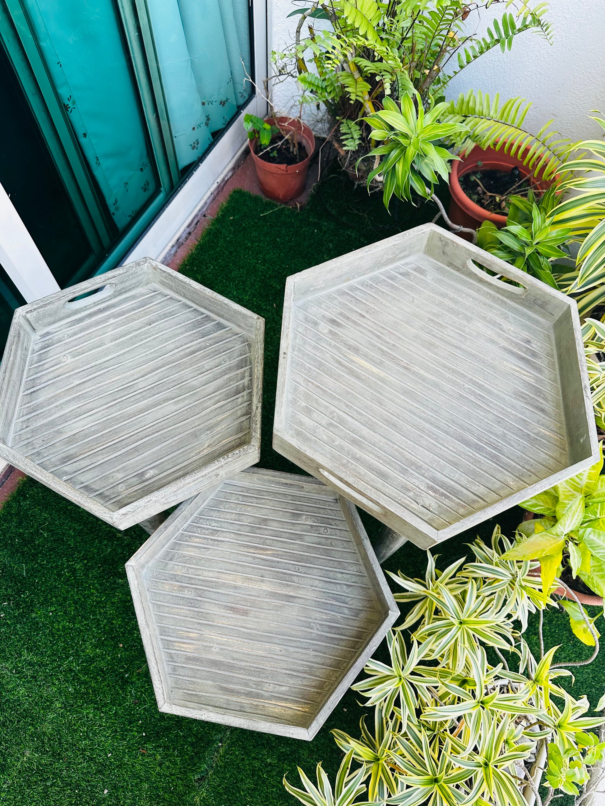 Elevate your living space with this exquisite set of six-sided hexagon side tables, crafted from premium mango wood. Each table is thoughtfully designed with a washed grey finish that gives a charming antique look.