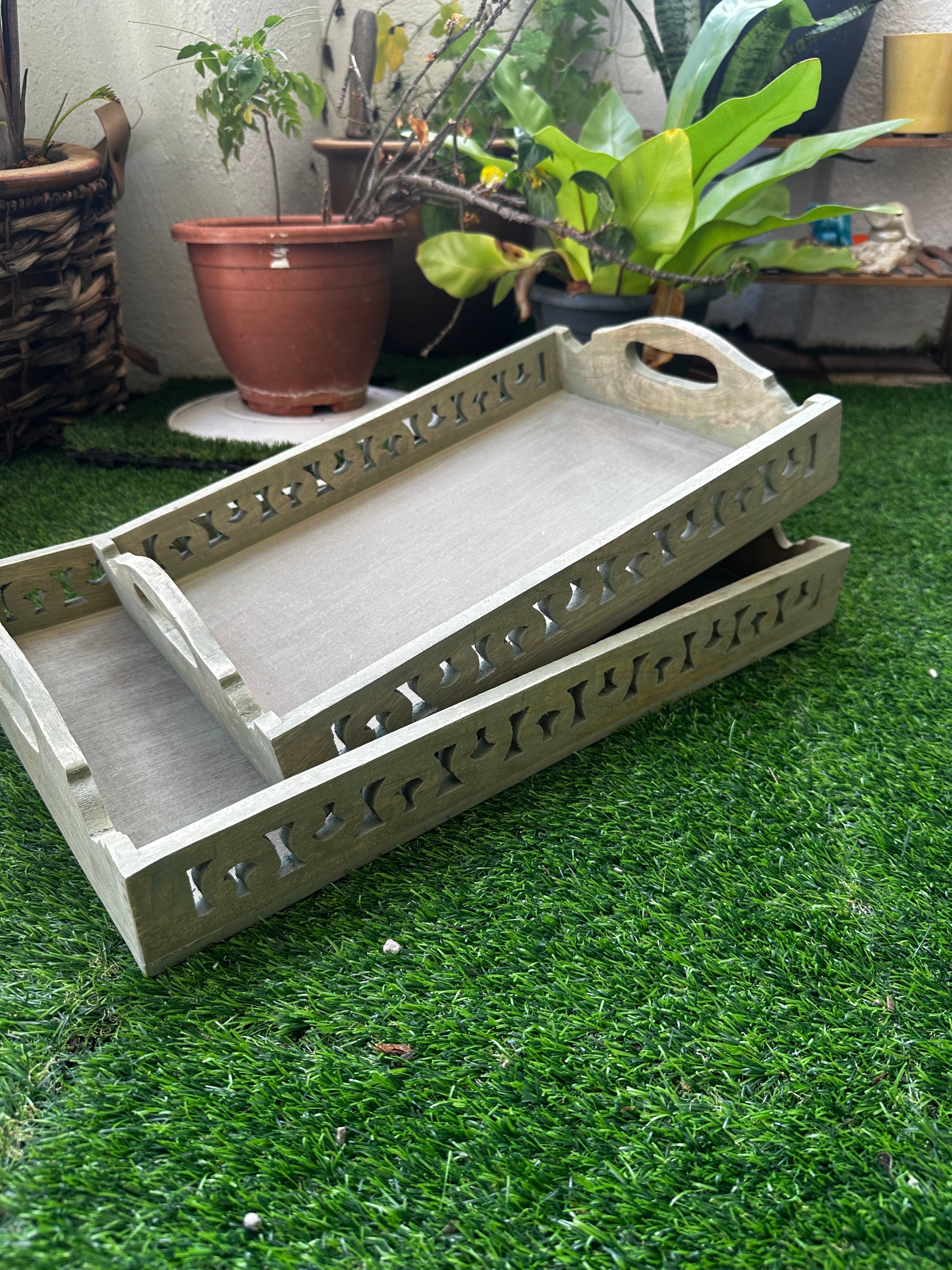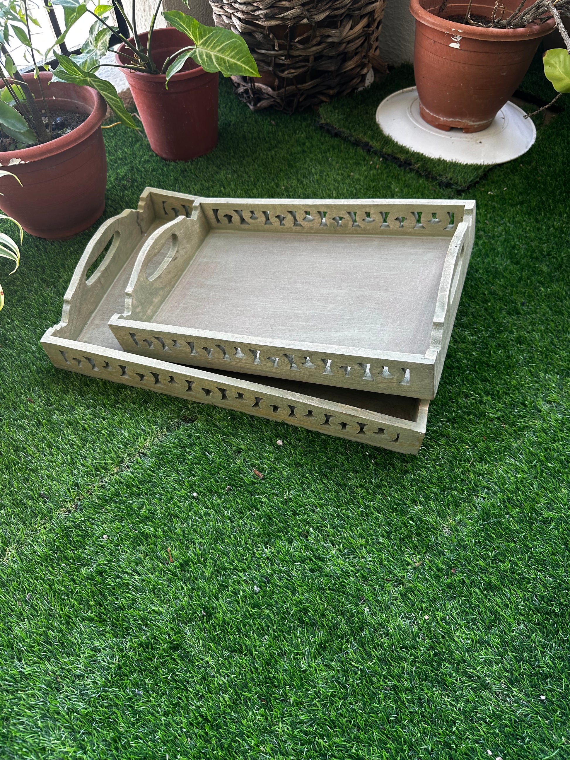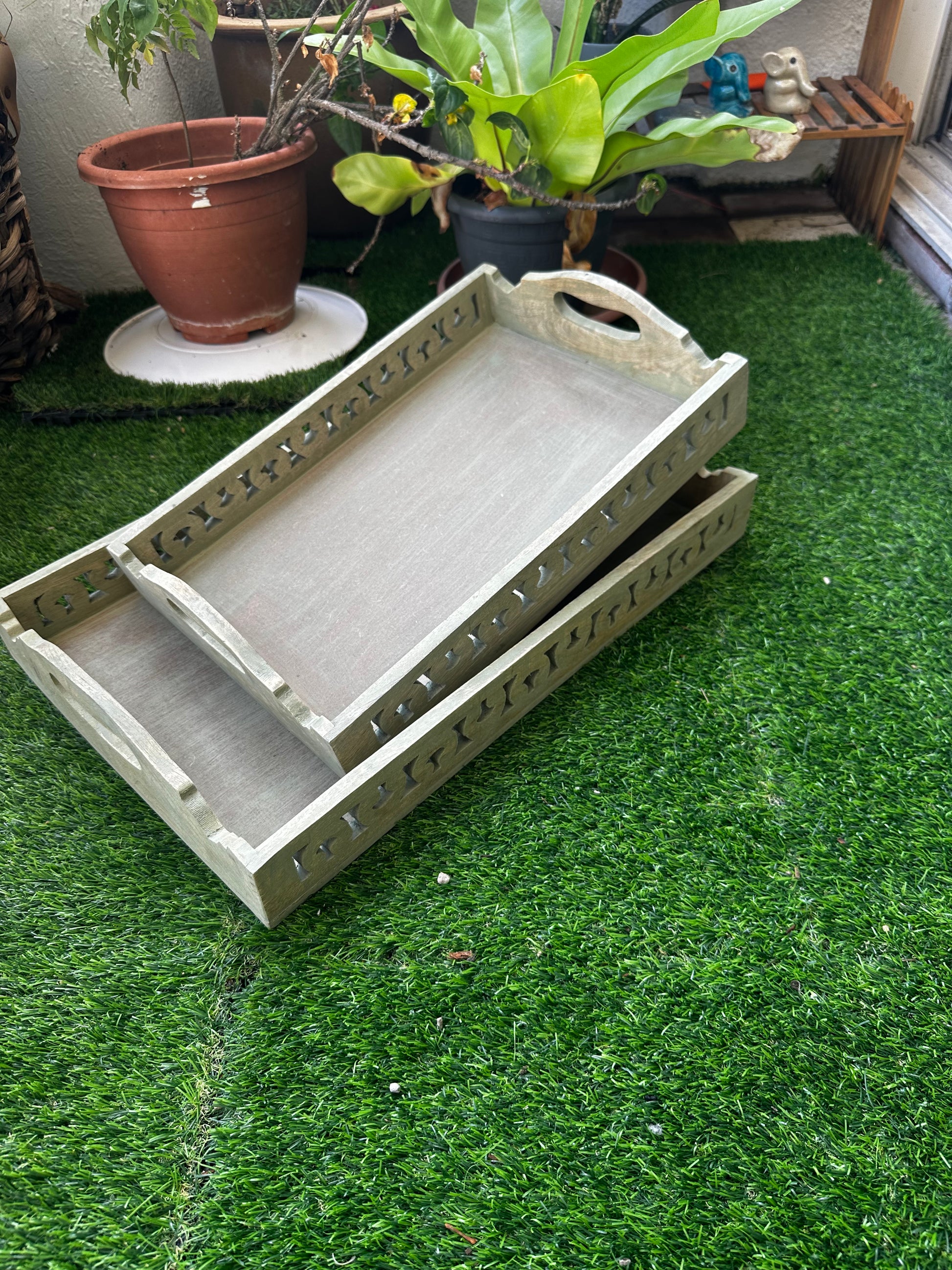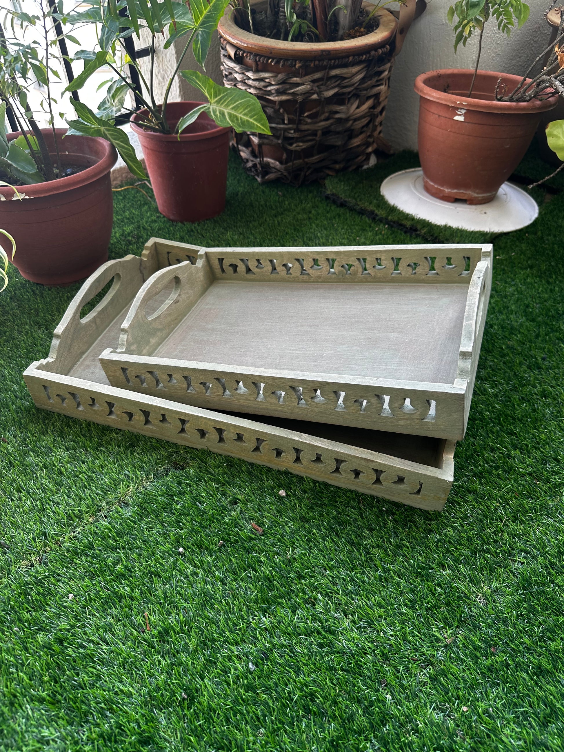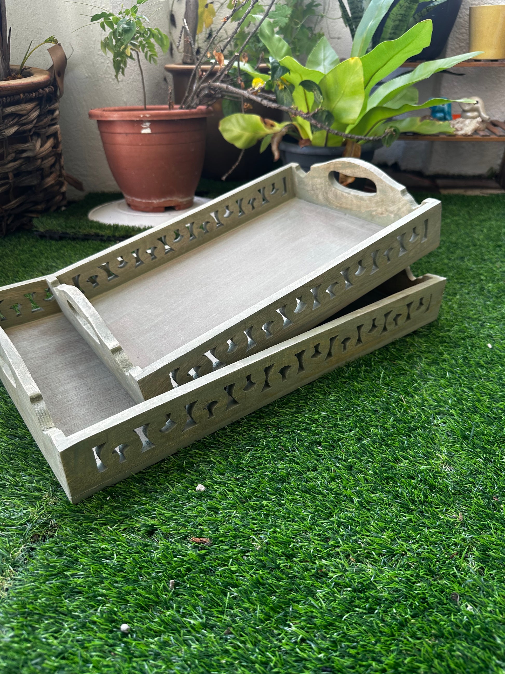 Bring artisanal beauty to your home with these rectangular trays handcrafted from solid mango wood, finished in a washed green hue that have a rustic, vintage charm. The sides are adorned with intricate hand-carved patterns, giving each tray a touch of timeless craftsmanship and making them as decorative as they are functional.