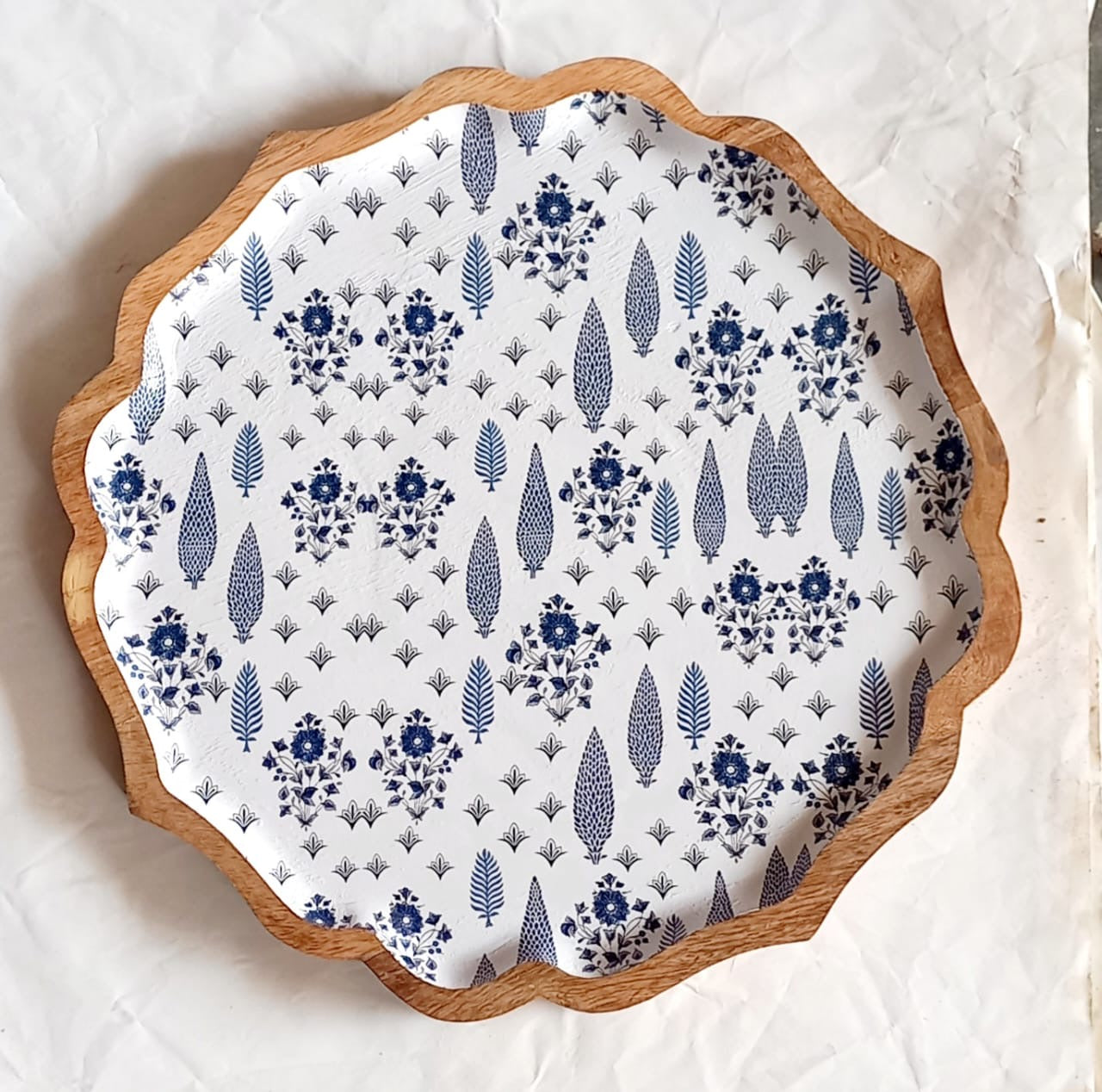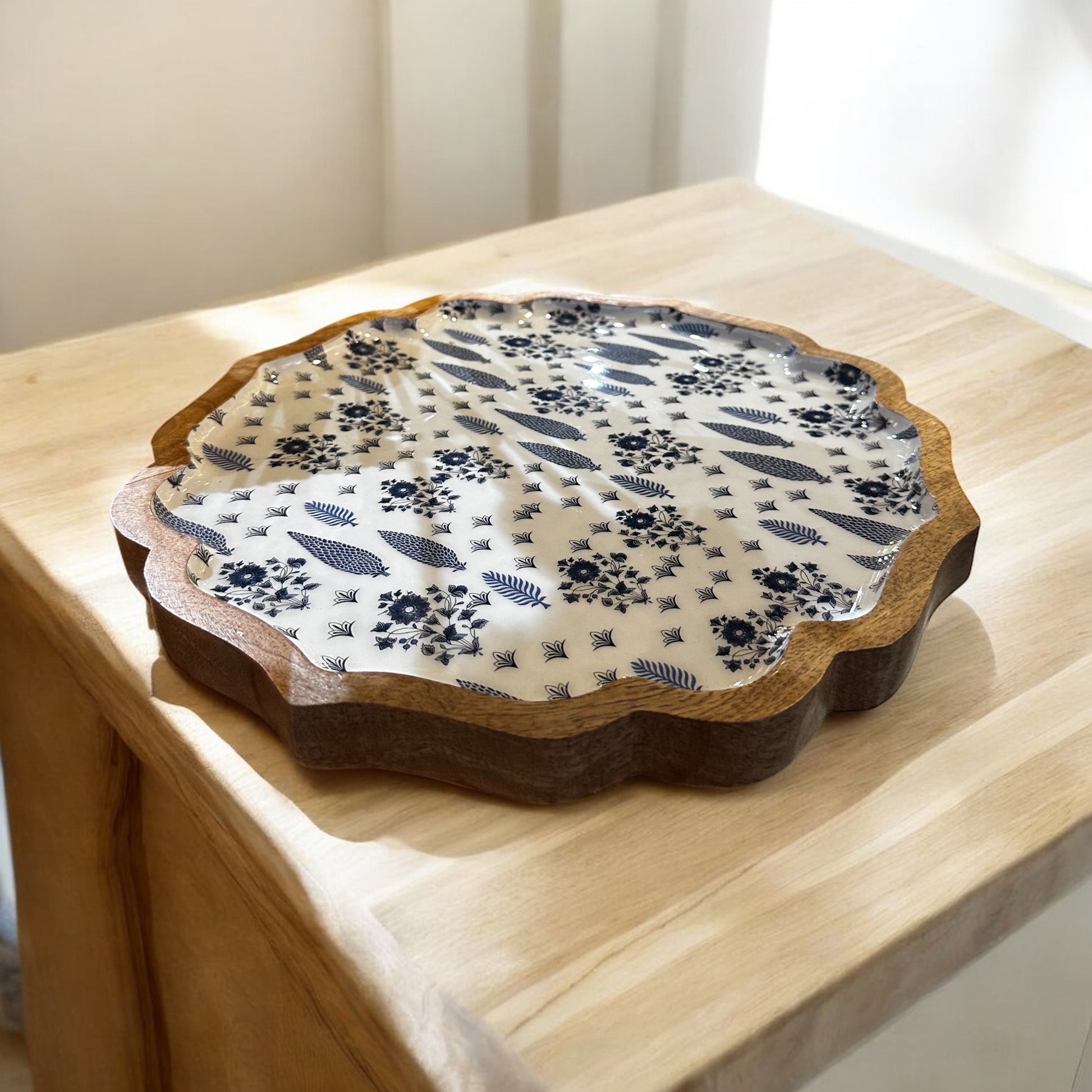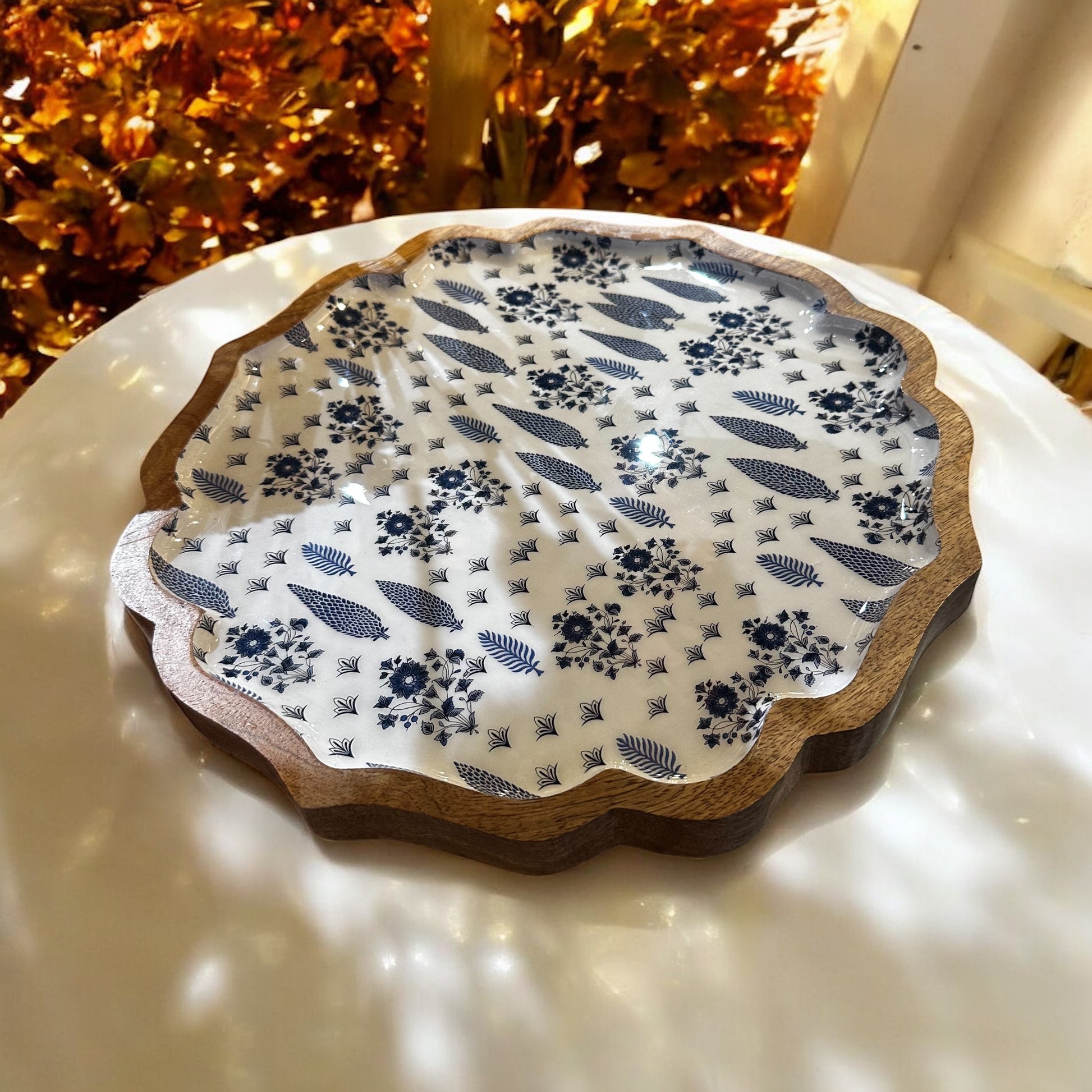 Celebrate the festive season with this charming acacia wood platter, designed to bring holiday cheer to your table. Crafted from durable acacia wood, the platter features uneven, organic edges and a raised boundary, giving it a rustic yet elegant appeal. The white and blue Christmassy enamel print adds a playful, festive touch that’s perfect for seasonal gatherings.