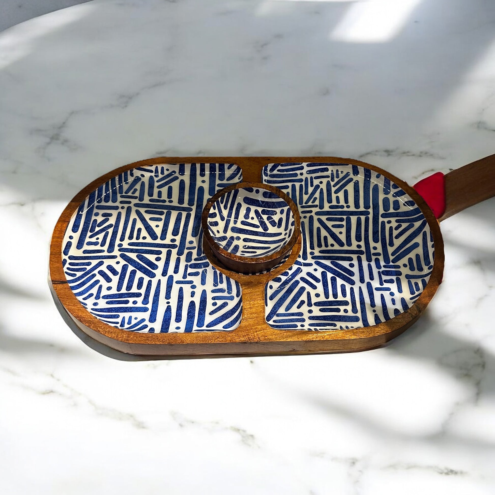 Bring color and craftsmanship to your table with this vibrant acacia wood serving platter, designed with a central bowlfor dips or sauces and ample space on both sides for snacks, breads, or appetizers. The surface is finished with a hand-applied blue and white enamel print, adding a refreshing burst of pattern against the rich natural grain of acacia wood. Perfect for entertaining, this platter combines functionality with artistic flair, making every serving a stylish experience.
