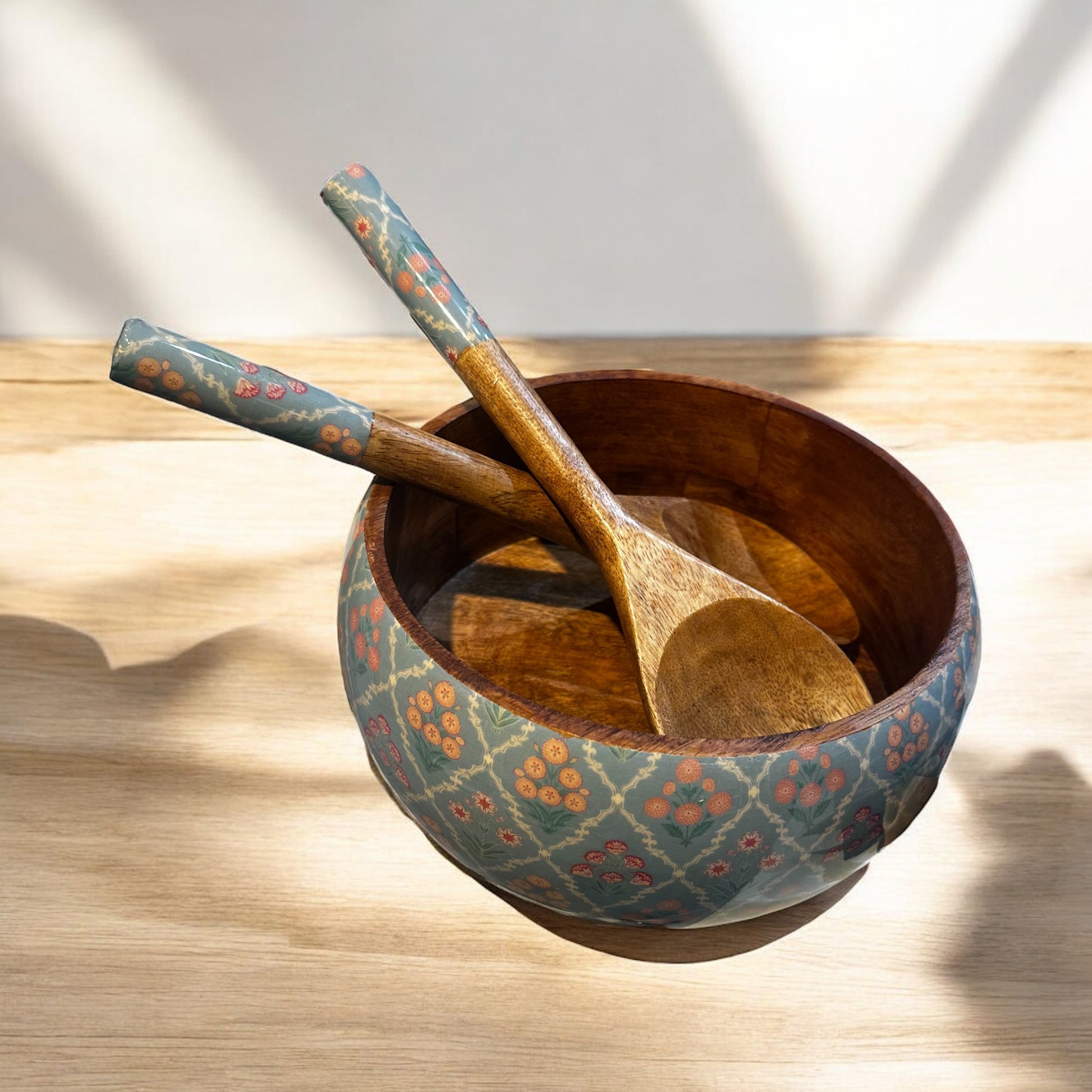 Bring a touch of freshness to your table with this handcrafted mango wood salad bowl, highlighted by a light blue floral enamel print. Paired with two matching servers, it’s ideal for tossing and serving salads, fruits, or pasta in style. The natural mango wood exterior adds warmth and durability, while the delicate floral enamel interior lends a soft, uplifting charm to everyday dining and special occasions alike.