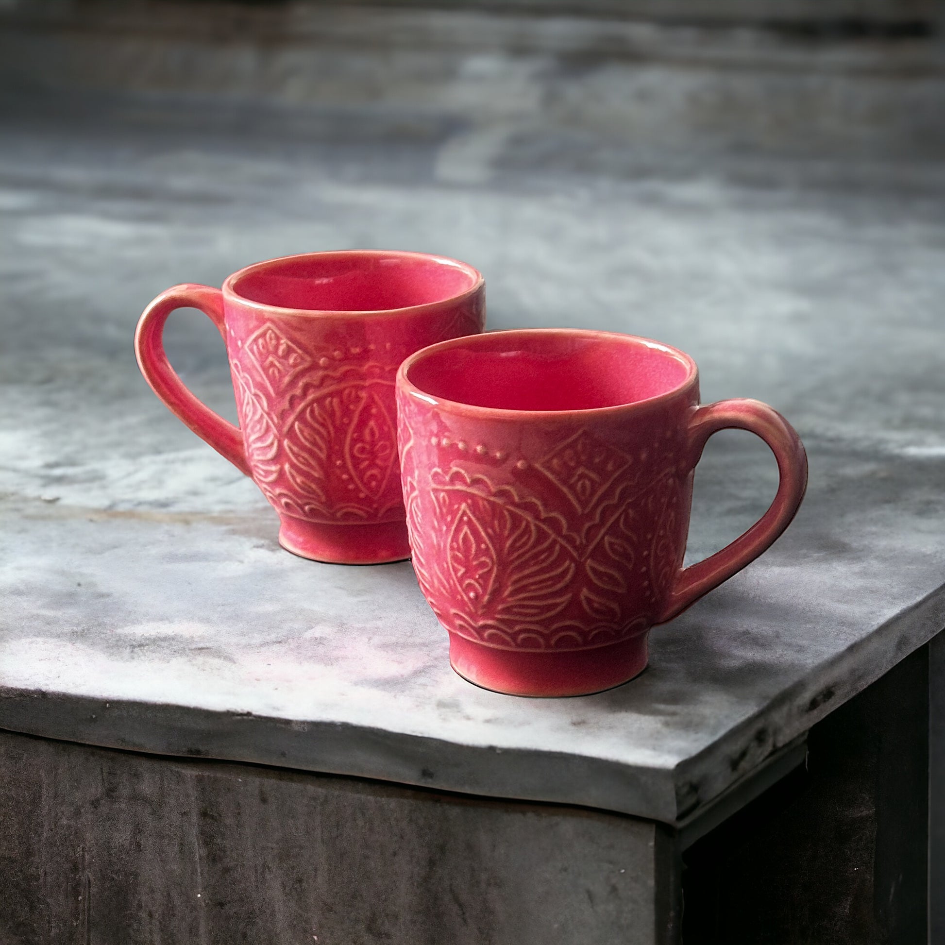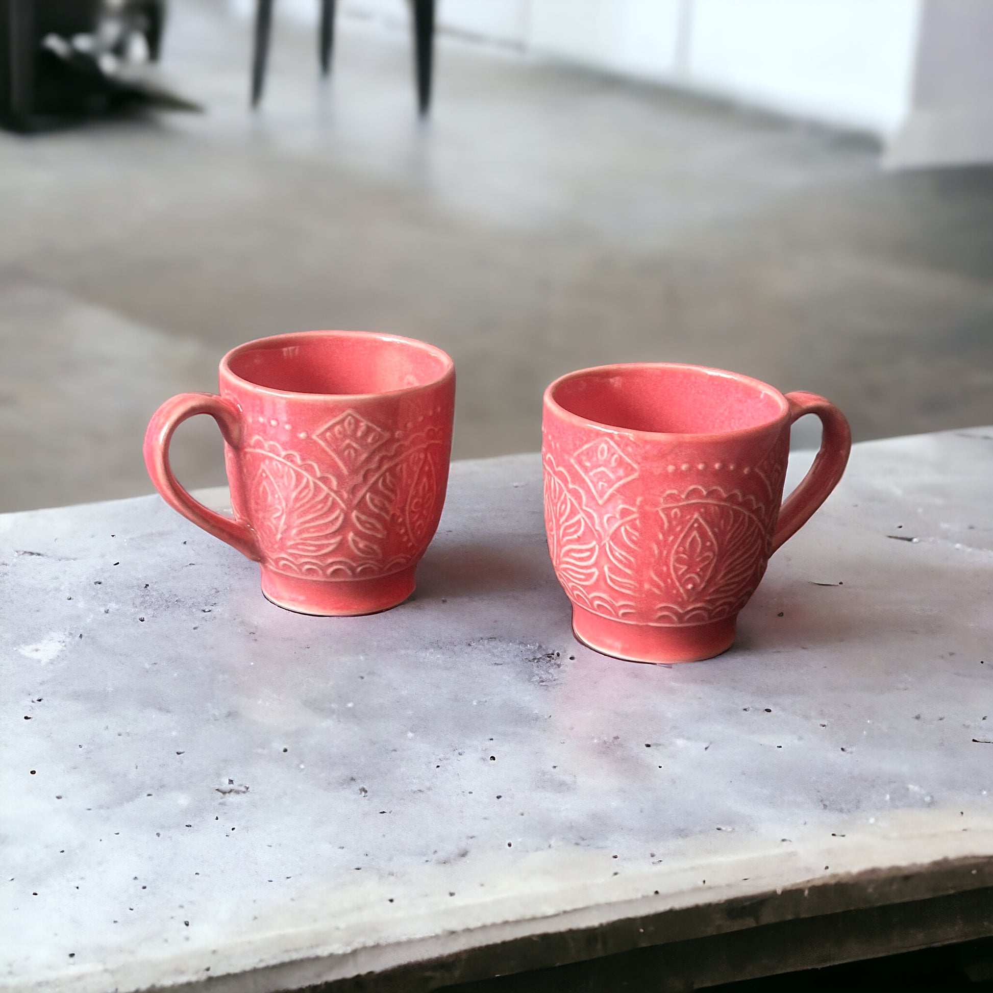 Embossed with intricate patterns reminiscent of traditional pottery techniques, these mugs add a touch of rustic allure to your beverage experience. The soft pink hue infuses a sense of warmth and tranquility, making every sip a moment of pure delight.