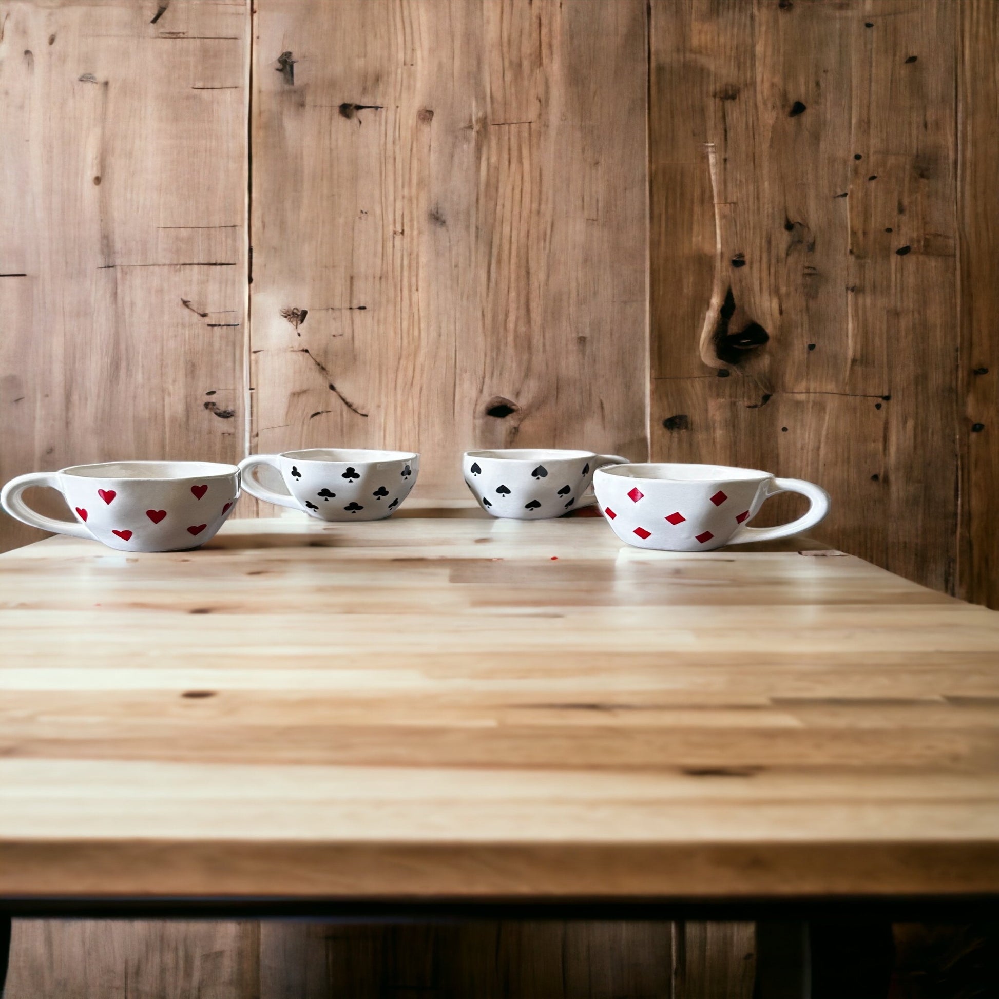 Crafted from high-quality ceramic, these mugs feature a striking design inspired by classic playing cards. The black and white and red and white card suits, along with the iconic card symbols, that create a visually captivating pattern that's sure to impress.